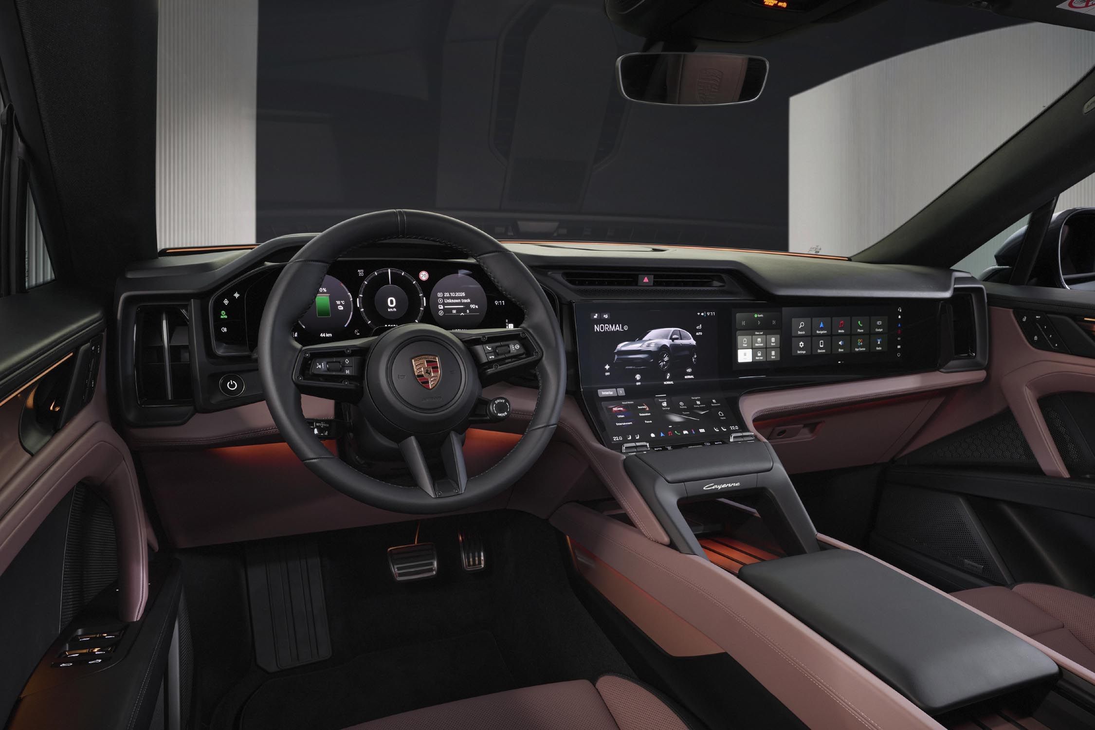 Au cœur de cet habitacle qui profite aussi d'un toit panoramique coulissant et d'un nouveau système de chauffage des panneaux, on trouve le nouveau Porsche Driver Experience et le Flow Display, un écran OLED incurvé qui s'intègre à la console centrale. Il est complété par un combiné d'instruments entièrement numérique doté de la technologie OLED de 14.25 pouces et, en option, par un écran passager de 14.9 pouces. L'ensemble forme ainsi la plus grande surface d'affichage proposée à ce jour dans une Porsche. Pour la première fois sur le Cayenne, un affichage tête haute avec réalité augmentée est également disponible, projetant une image d'une diagonale de 87 pouces à 10 mètres devant le véhicule.