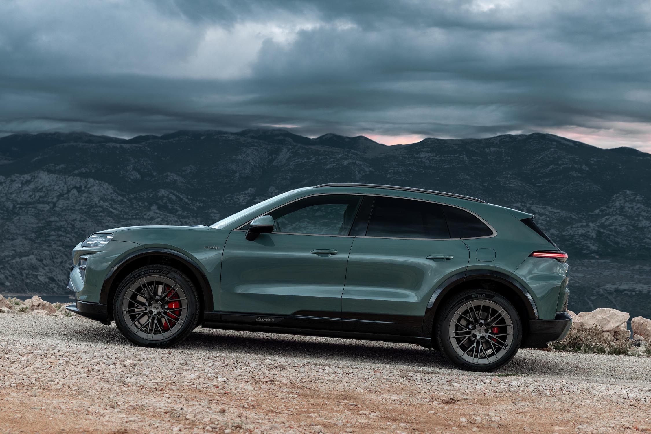 Esthétiquement, le Cayenne Electric se distingue notamment par son capot bas doté de phares Matrix LED effilés, ses ailes aux contours marqués, sa ligne de toit fuyante et ses portes sans cadre. Les bas de caisse sont peints en Gris Volcanique métallisé et, sur le Cayenne Turbo, en noir brillant. À l'arrière, on note la présence d'un bandeau lumineux à l'effet 3D distinctif et aux graphismes animés, ainsi que d'un monogramme Porsche illuminé.