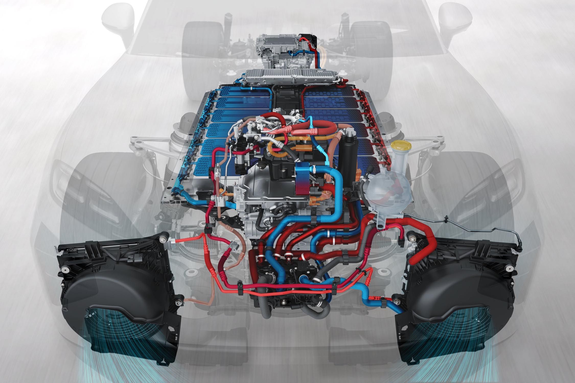 Le constructeur allemand a également travaillé le système de refroidissement du Cayenne Electric. Ce système à double refroidissement régulera la température de la batterie par le haut et par le bas, ce qui permettra un contrôle précis de la plage de température et garantira que la batterie fonctionne toujours dans la plage optimale. Pour la première fois, des ventilateurs à pression à haut rendement énergétique seront utilisés, consommant environ 15 % d'énergie en moins que les ventilateurs à aspiration classiques, ce qui garantira une capacité de recharge élevée et constante et des performances accrues avec une perte d'énergie minimale.