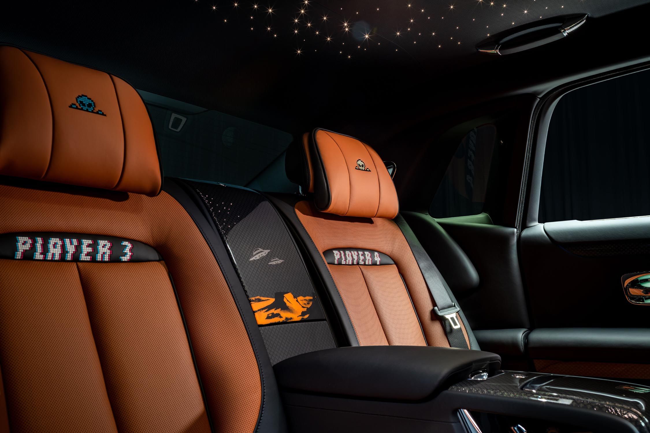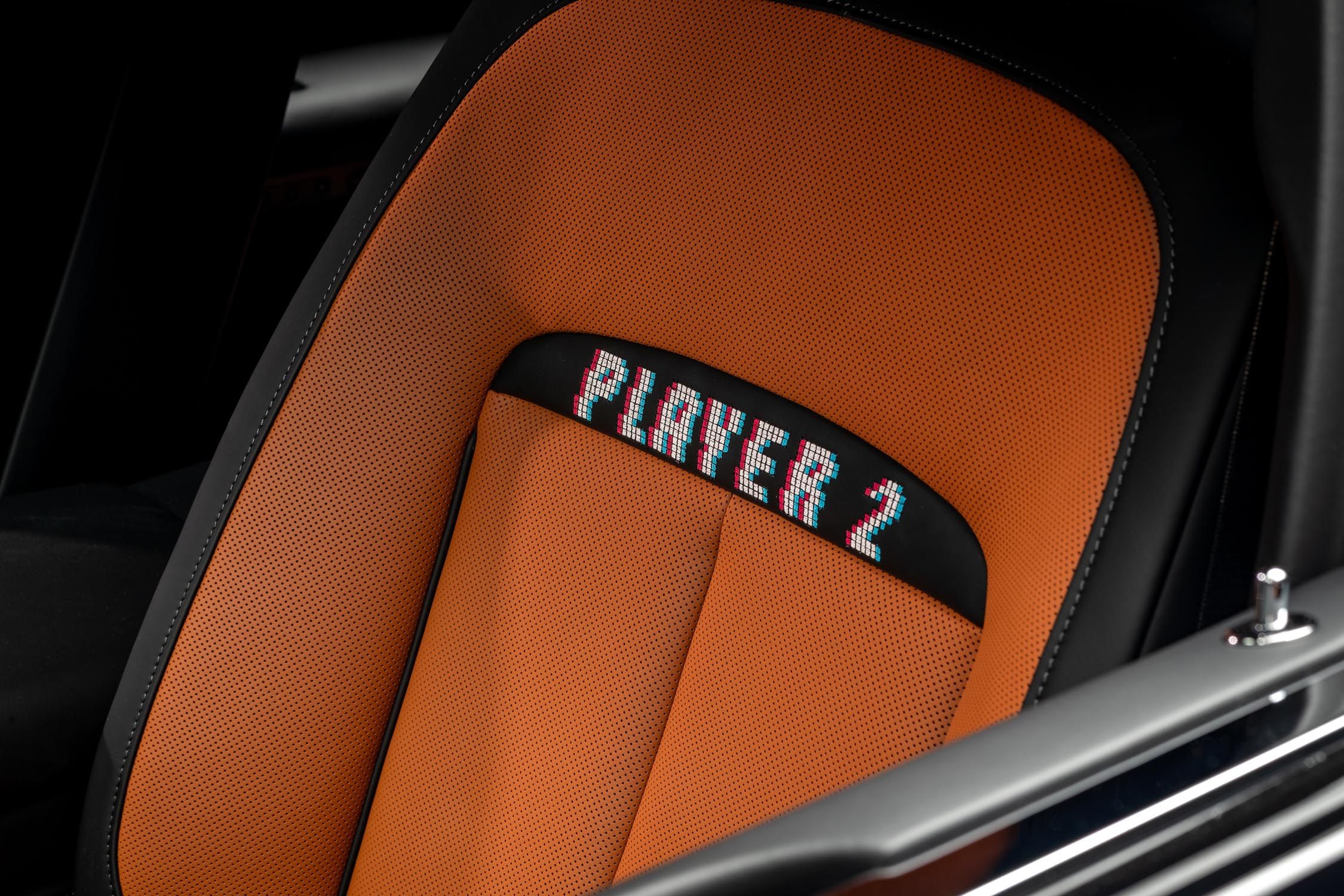 Passant dans l'habitacle du véhicule, les designers du collectif Rolls-Royce Bespoke ont opté pour des habillages de couleur noir et beige « Casden », rehaussés d'une broderie « Player One » dans une police de style 8 bits sur les sièges, de broderies « Cheeky Alien » en aplats de couleur sur les appuie-tête, d'un tableau de bord illuminé « Laser Base » unique et d'une multitude de clins d'œil à l'ère du joystick.
