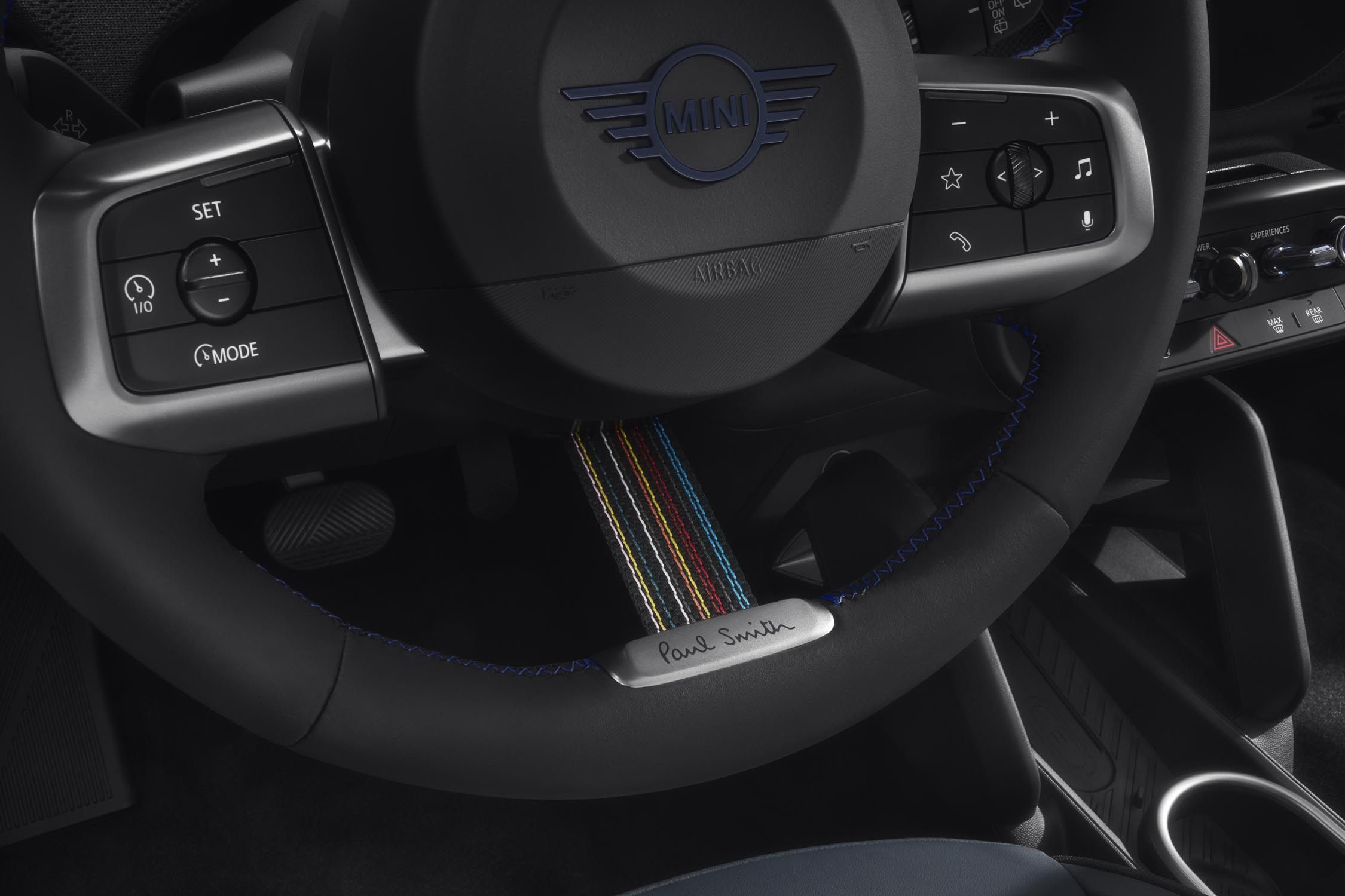 Côté habitacle, la MINI Paul Smith Edition reçoit des sièges Sport réalisés dans une teinte « Nightshade Blue », qui arborent les bandes Paul Smith emblématiques sur le haut des assises, ainsi qu'un logo Paul Smith brodé et des surpiqûres bleues que l'on retrouve également sur le volant. Celui-ci arbore le logo MINI noir et bleu, et sa partie inférieure est ornée de la célèbre « Signature Stripe » Paul Smith et du nom de la marque.