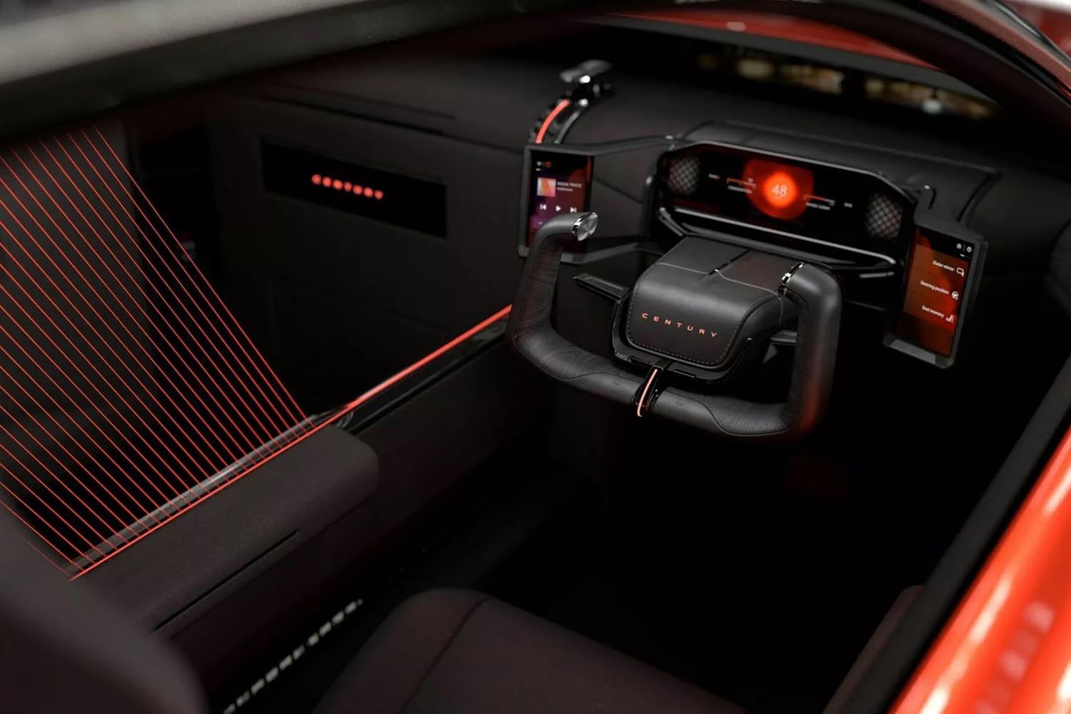 Le coupé deux portes dispose par ailleurs d'un habitacle très moderne, voir futuriste, présentant un aménagement asymétrique réalisé dans des matériaux nobles. Le conducteur est en effet isolé de l'autre passager (le coupé Century n'offre que deux places assises) par une paroi transparente (une vitre ?) qui délimite son espace. Le poste de conduite est pour sa part équipé d'un siège avec dossier en bois, d'un volant rectangulaire et d'un tableau de bord constitué de trois écrans.